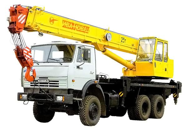 Автомобильный кран КС-45717К-1, грузоподъемностью 25 т для работы с обычными грузами и грузоподъемностью 20 т для работы с ядовитыми и взрывоопасными грузами, смонтирован на шасси КамАЗ-53229, 55111, 53215.